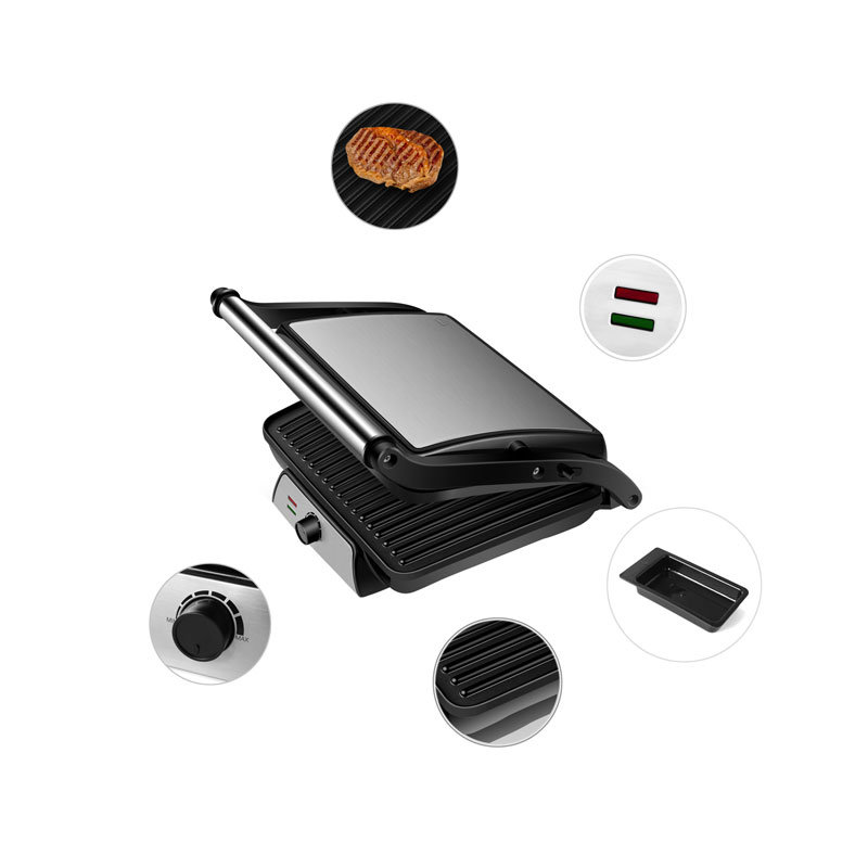 | Drag | Cool-touch säkert handtag; Droppskål för uppsamling av överflödig olja ; Justerbar temperaturkontrollknapp; Non-stick beläggning för enkel rengöring; Flytande gångjärnssystem anpassar sig automatiskt till alla storlekar av rostat bröd, kött eller snacks Kan öppnas 180° som en öppen grill, ström på och klara lampor, halksäkra fötter |